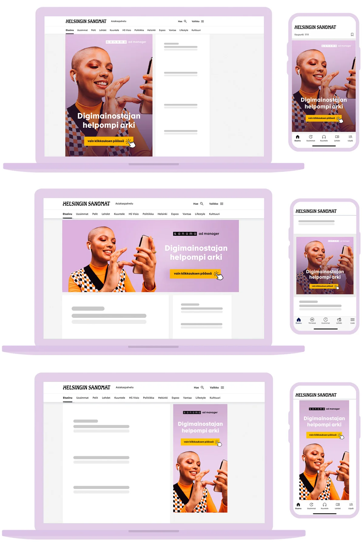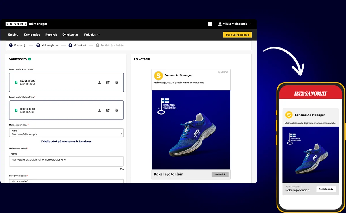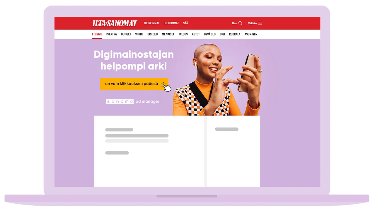 Sanoma Ad Managerilla teet itse helposti display-kampanjoita Sanoman mainosverkostoon. Käytössäsi on monipuolinen valikoima mainosmuotoja eri tavoitteisiin.