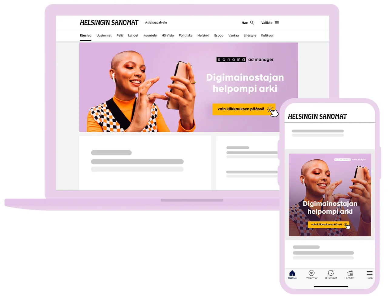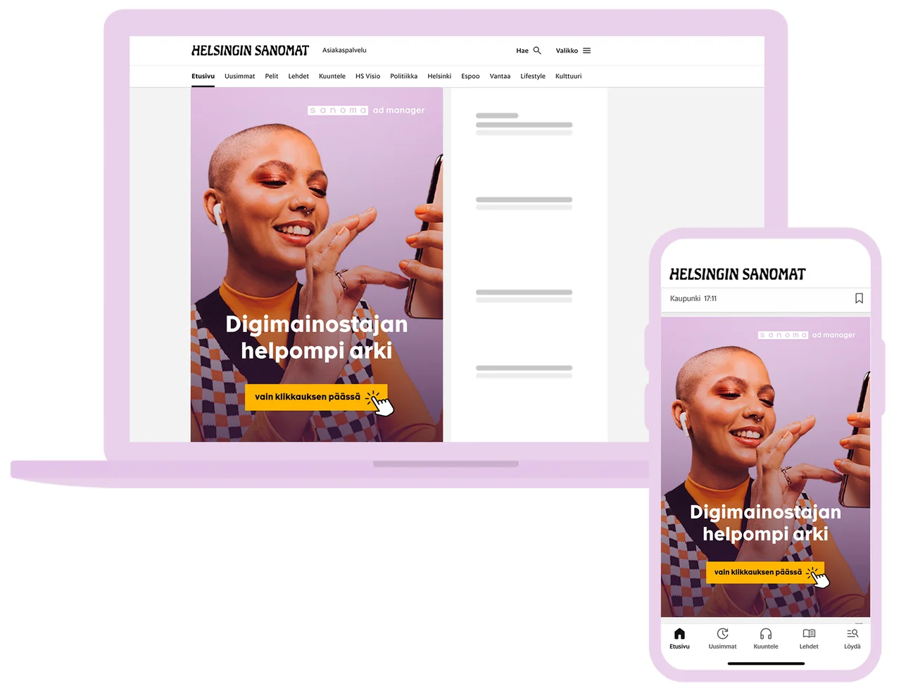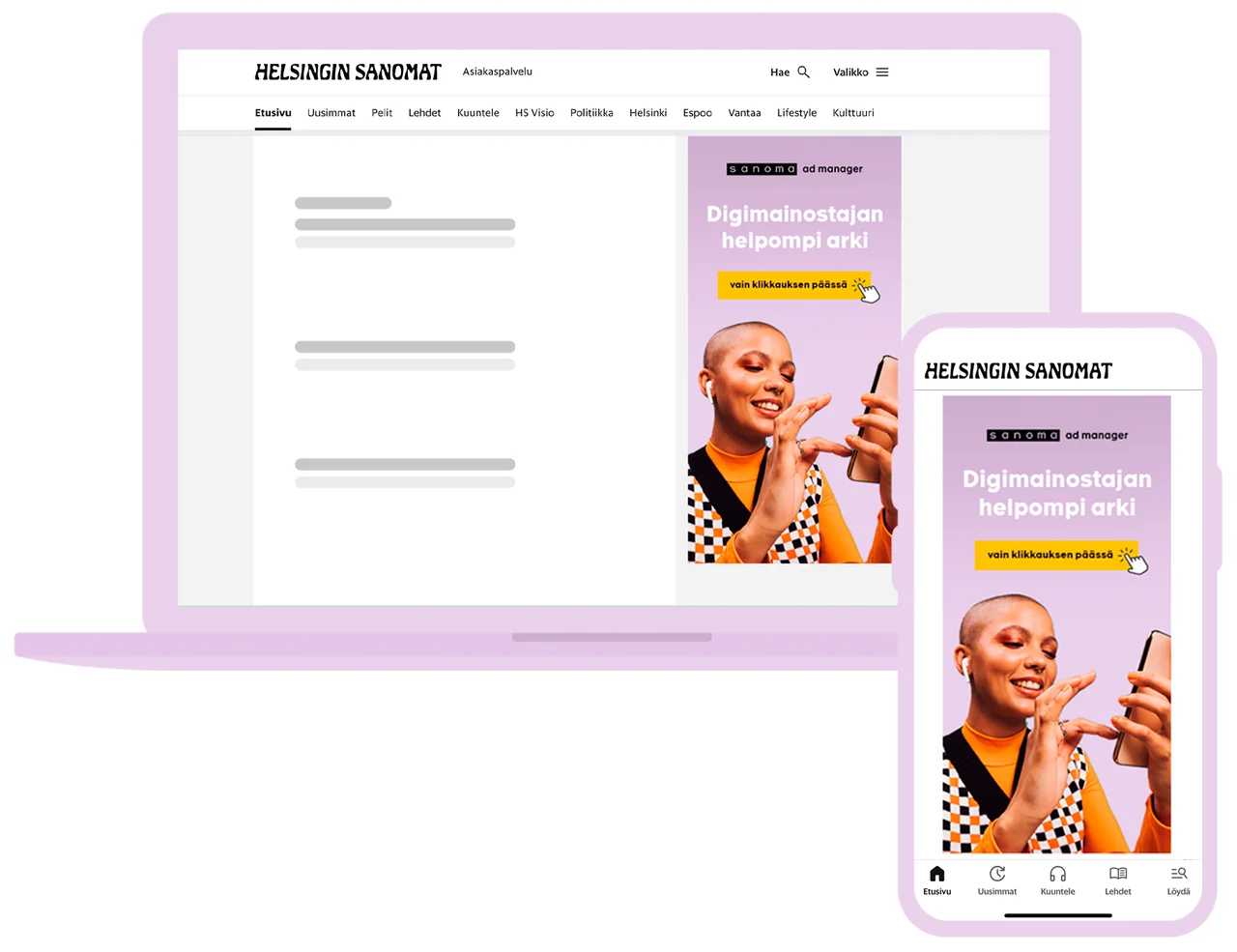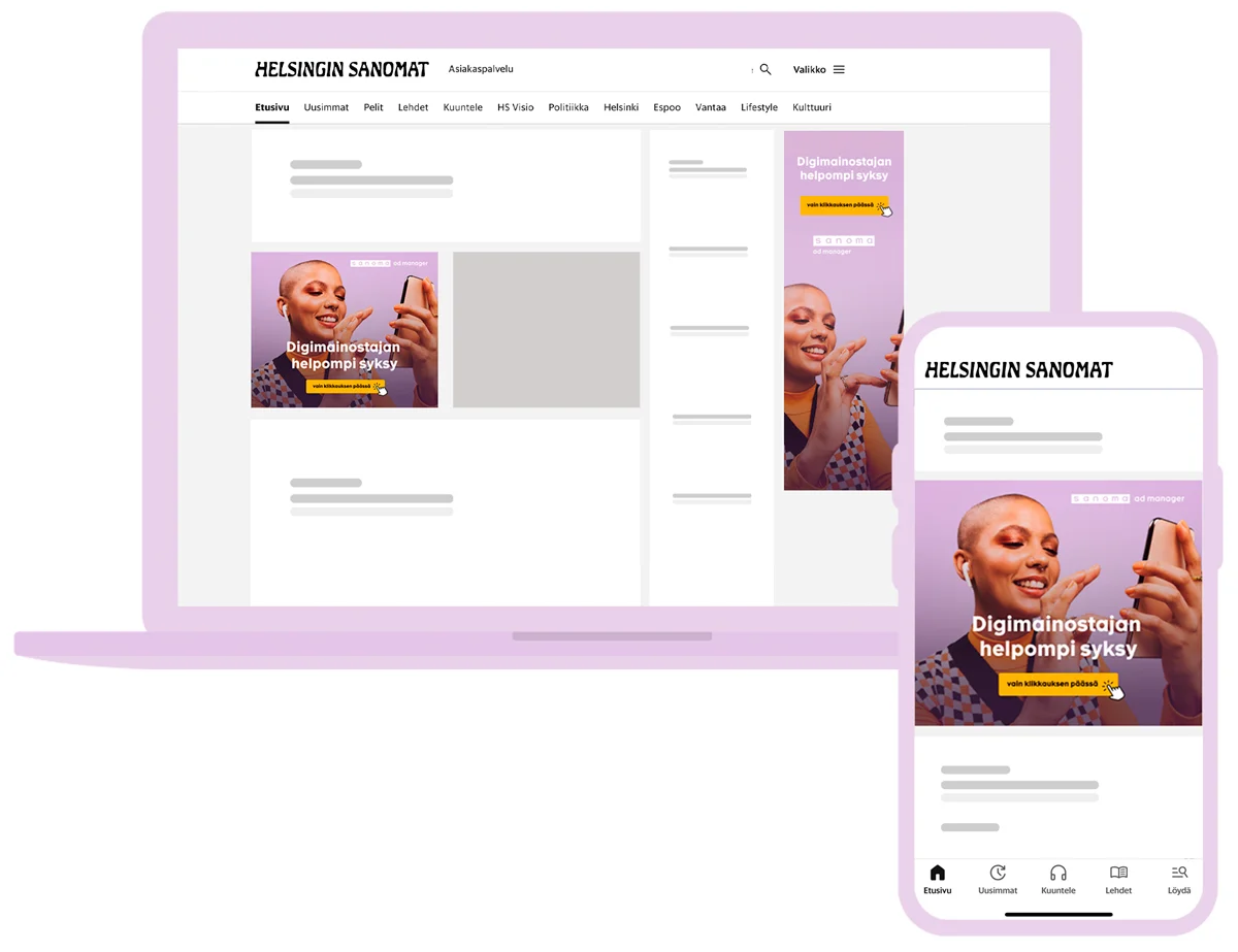 Saat mainoksen helposti ja nopeasti Suomen päämedioihin ja tavoitat asiakasryhmiä, joita et tavoita muista kanavista. Sanoman digiverkosto tavoittaa 89 % eli 3,4 miljoonaa suomalaista viikoittain. Verkostoon kuuluu valtakunnallisia ja paikallisia uutissivustoja sekä lifestyle-sivustoja.