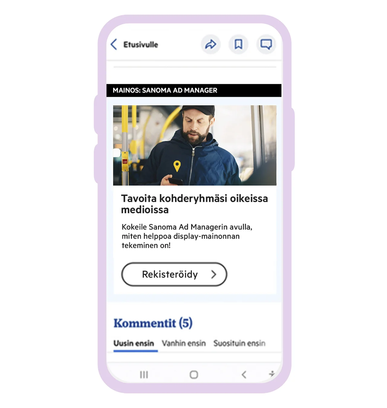 Rekisteröidy maksutta ja aloita mainonta Sanoman tavoittavissa digimedioissa.