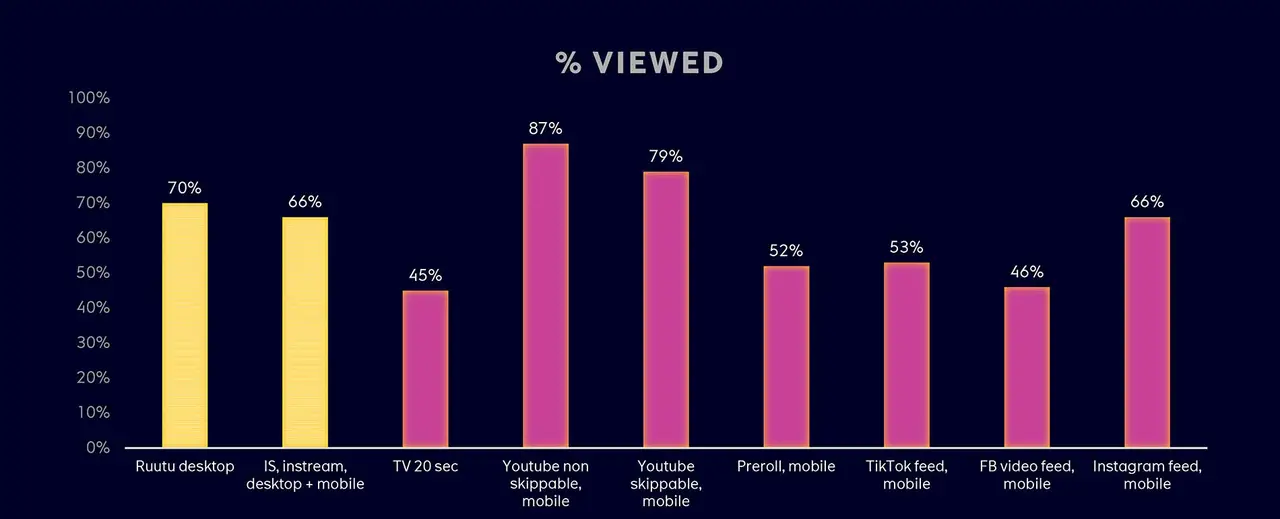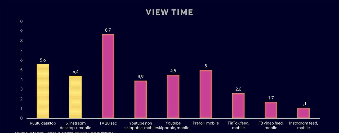 Lähteet: IS, Ruutu: dentsu – Sanoma 2023 (Viomba) TV: Tvision/Lumen UK TV Panel. YT, Instream, Teads, Facebook Feed, Banners: Lumen digital panels. IG, FB Watch, TikTok: Lumen.
