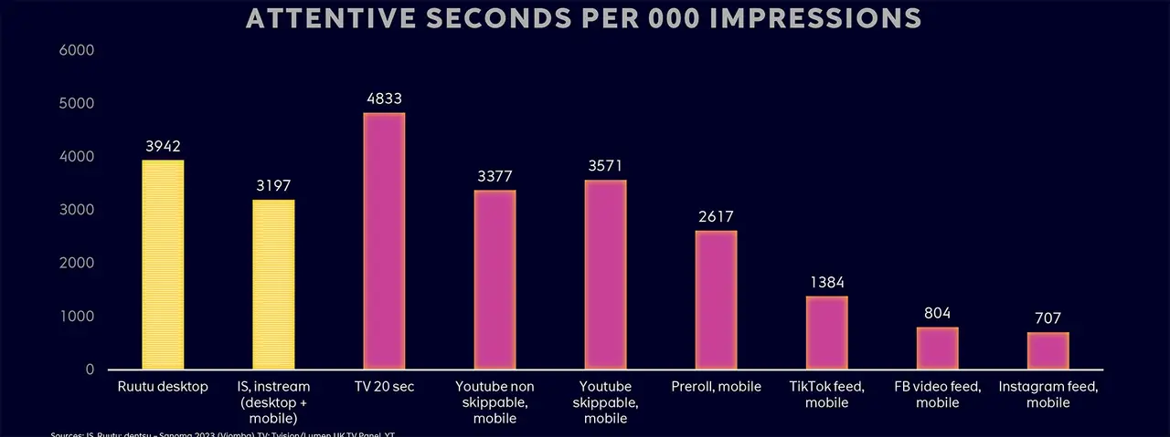 Mainonnan attention-tutkimus osoittaa: Ruudun ja IS.fi:n videomainonnan huomaaminen päihittää useimmat somejätit