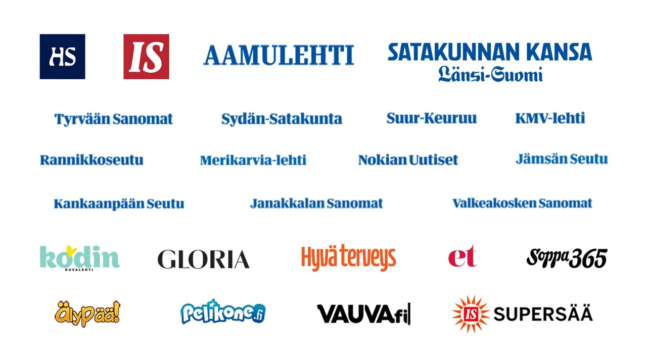 Sanoman digiverkosto tavoittaa viikoittain 89 % suomalaisista. Sivustoistamme löytyy jokaiselle jotakin, siksi myös kaikille mainostajille löytyy paikka ja sopiva kohderyhmä. Esimerkiksi suositut is.fi, hs.fi, vauva.fi, soppa365.fi ja tiede.fi kuuluvat siihen. Verkostomme vahvuuksia ovat myös useat paikallislehdet, kuten aamulehti.fi, nokianuutiset.fi, rannikkoseutu.fi ja sydansatakunta.fi. Jos toimintasi on alueellista, tavoitat helposti ja kustannustehokkaasti juuri oman paikkakuntasi asiakkaat.