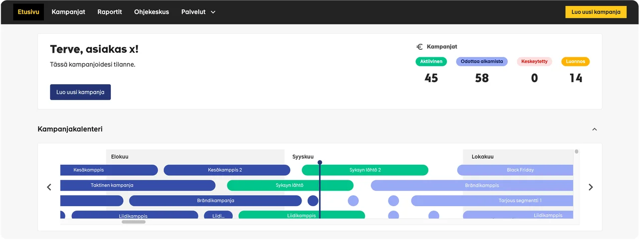 Syksy on kiireistä aikaa. Kiireahdistuksen vältät suunnittelemalla ja aikatauluttamalla kampanjat etukäteen. Mainonnan itseostoalusta Sanoma Ad Managerin kampanjakalenterin avulla voi tehdä täsmälähdöt valmiiksi. Tarvittaessa voit tehdä muutoksia kampanjoihin ja lisätä nopeita lähtöjä. Kampanjakalenterin avulla kampanjat on myös helppo hahmottaa aikajanan muodossa. Näet yhdellä silmäyksellä, minkälaisia kampanjoita on käynnissä ja tulossa.