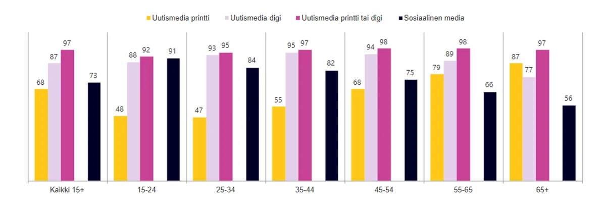 – Uutismedian tavoittavuus on aivan omaa luokkaansa. Ne nuoret, joita et saa kiinni somesta, voi saada kiinni maksuttomista uutismedioista, esimerkiksi Ilta-Sanomista. Somen käyttö myös vaihtelee elämäntilanteen mukaan. Ja vaikka käytössä ei olisi yhtään somekanavaa, tulee uutisia luultavasti seurattua useammastakin kanavasta, Syrjäntö toteaa.