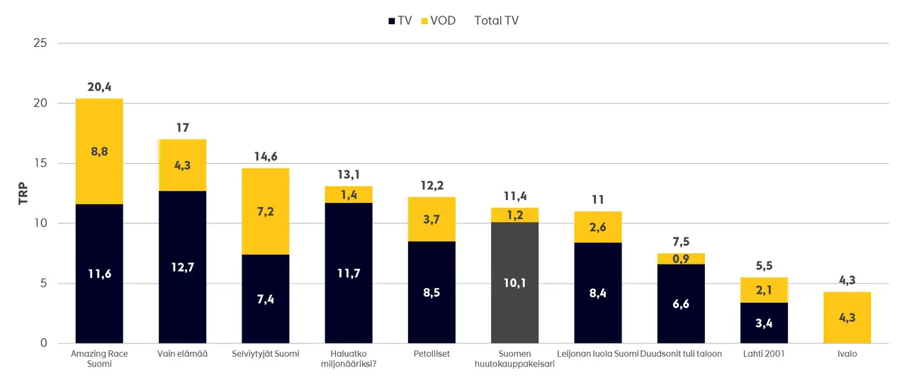 Lähde: Finnpanel Oy, Total TV -tutkimus, AdEdge VOD, 1.10. – 4.11.2023