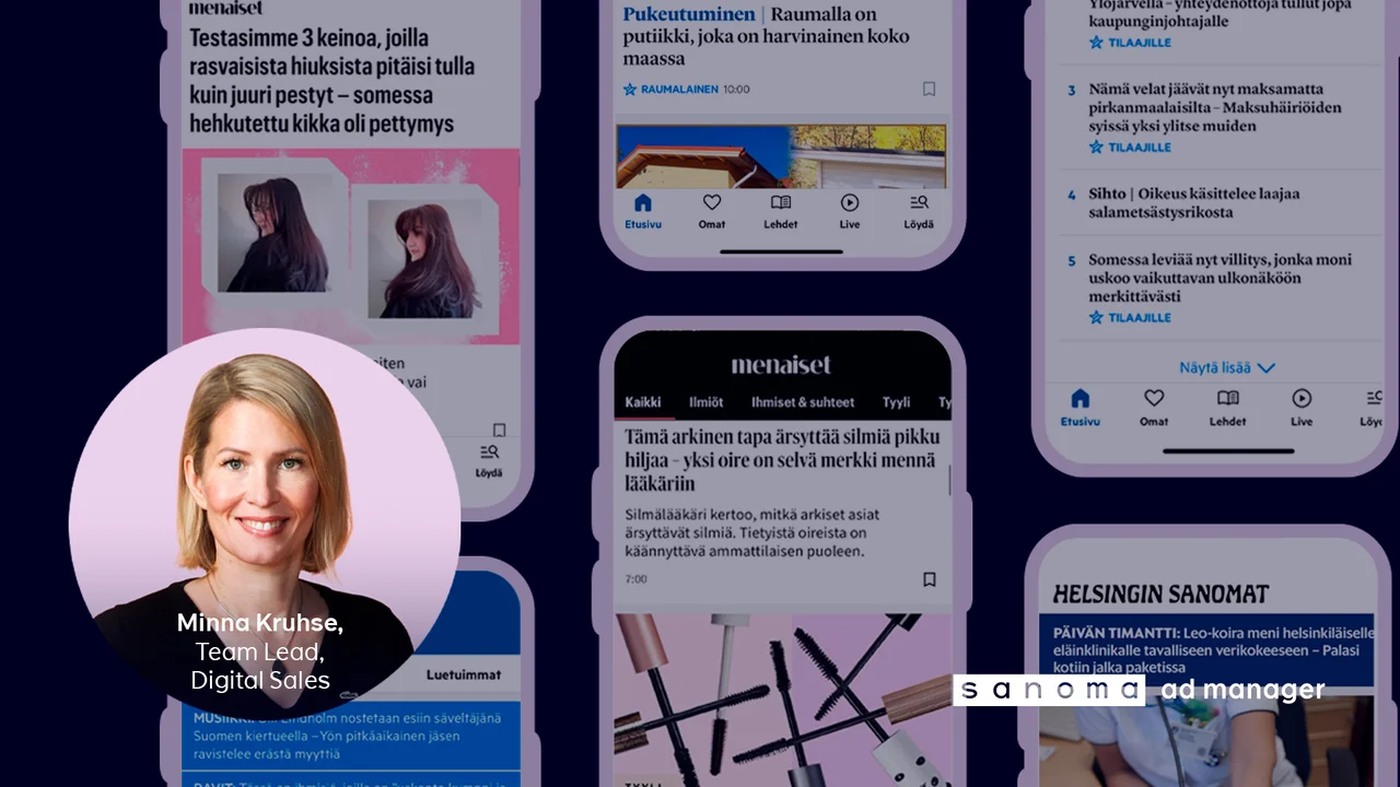 ”Tarjoamme Sanoma Ad Managerin avulla toimistoille mahdollisuuden nopeaan ja helppoon tapaan ostaa display- ja videomainontaa Sanoman verkostosta. Sanoma Ad Manager -kumppanuusohjelmaan kuuluvat toimistot ovat oikeutettuja itseostokorvaukseen, jota maksetaan Ad Managerin kautta ostetusta mainonnasta. Kumppanuusohjelmaan voi hakea mikä tahansa toimisto, joka ostaa asiakkaidensa puolesta mediaa”, kertoo Sanoma Ad Managerin Business Manager Lotta Montén.