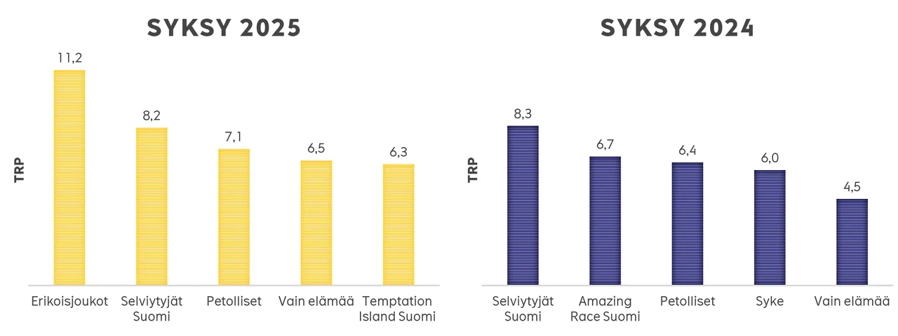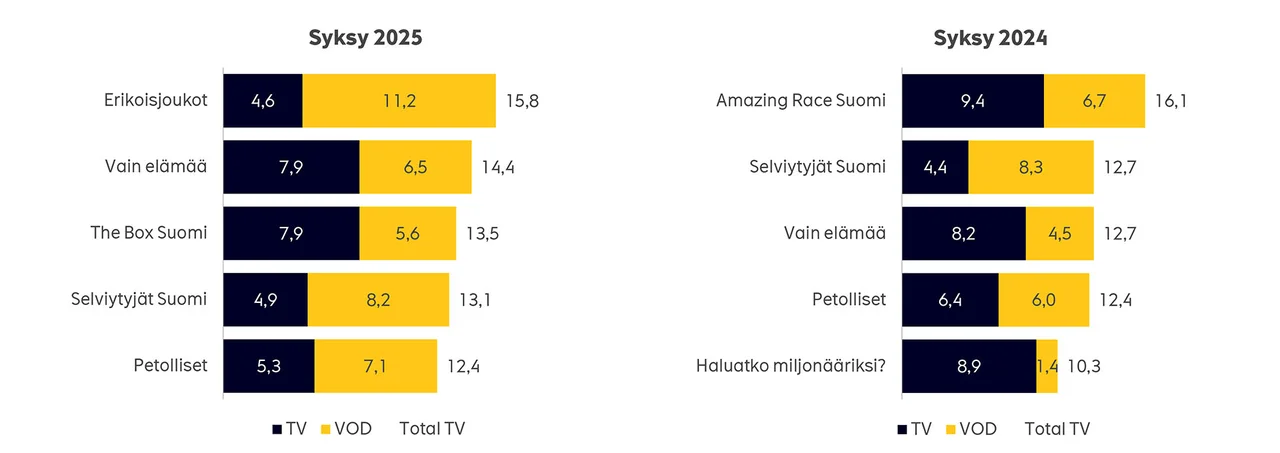 Lähde: Finnpanel Oy, Total TV -tutkimus, AdEdge VOD, 15.9.–26.10.2025 ja 16.9.–27.10.2024. Katsotuimmat ohjelmat A25–44-kohderyhmässä. Listattu vain katsotuin jakso ohjelmanimen mukaan. Ohjelmajakso sisältää aikajakson kaikki esitykset. Nelonen, Jim, Liv, Hero ja Ruutu ja Ruutu+