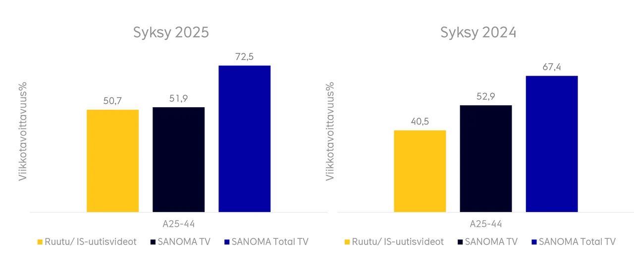 Lähde: Finnpanel Oy, Total TV -tutkimus, AdEdge VOD, 15.9.–26.10.2025 ja 16.9.–27.10.2024, A25–44-kohderyhmä. SANOMA TV = Nelonen, Liv, Jim, Hero. Ruutu/ IS-uutisvideot = Ruutu/Ruutu+ ja IS-uutisvideot.