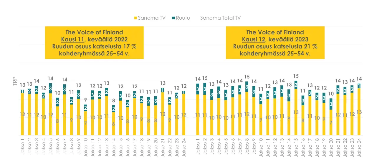 Kevään isointa ilmiöohjelmaa The Voice of Finlandia katsottiin sen lähetysaikaan Nelosella enemmän kuin edellisellä kaudella ja myös Ruudun osuus katselusta kasvoi. Ohjelman keskimääräinen viikkotavoittavuus yli 10-vuotiaiden kohderyhmässä oli 1269 000 vuonna 2022 ja 1 360 000 keväällä 2023 (Finnpanel Oy, TV-mittaritutkimus/AdEdge viikot 4-17 2022/2023 Nelonen)