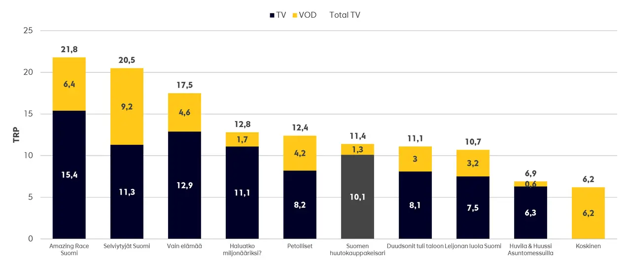 Lähde: Finnpanel Oy, Total TV -tutkimus, AdEdge VOD, 1.8. – 7.10.2023