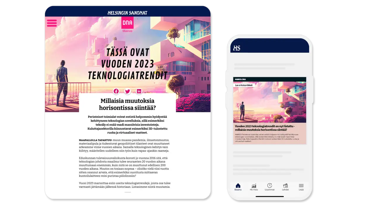 Kampanjassa haluttiin tehdä DNA:n yritysliiketoiminnan julkaisema teknologiatrendiraportti tutuksi HS.fi:n lukijoille ja kerätä raportille lisää latauksia.