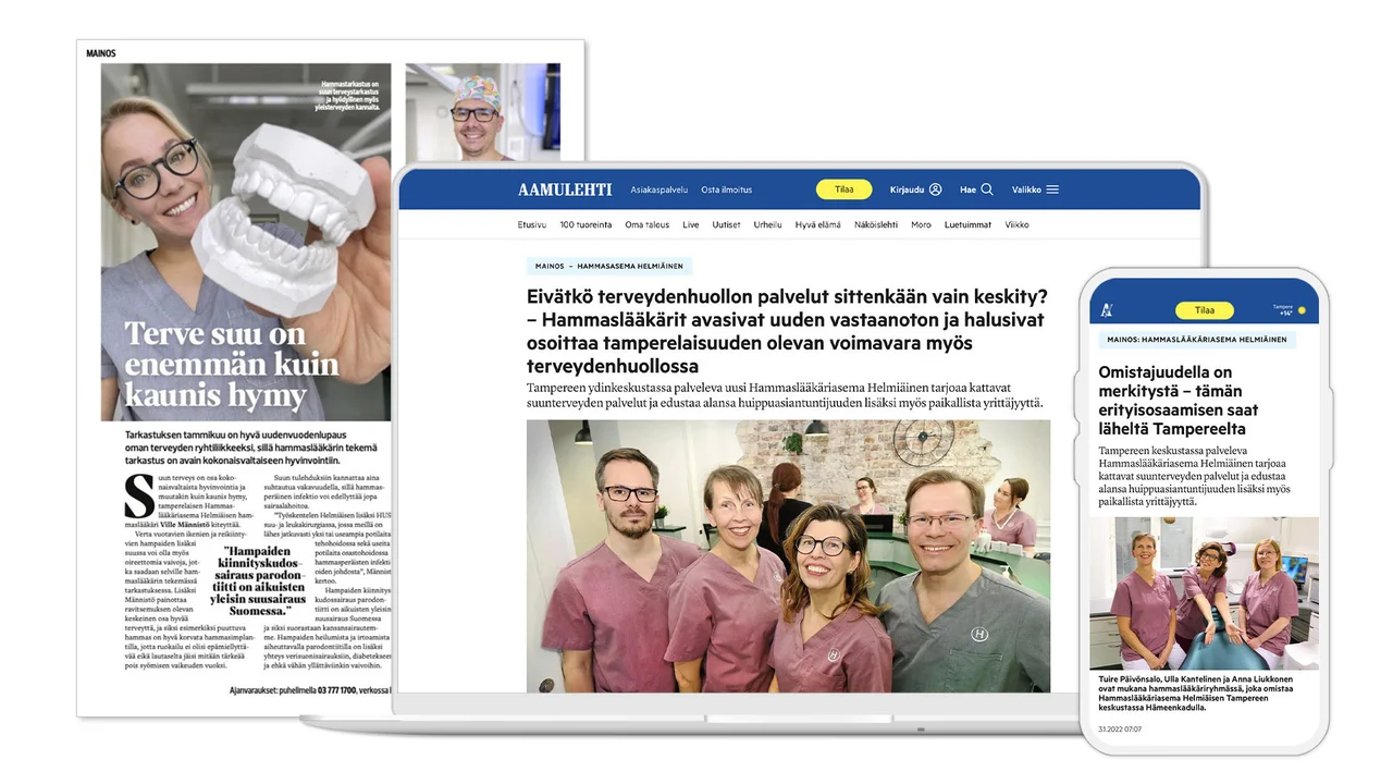 ”Totesimme, että mielenkiintoa herättävä artikkeli on tehokkaampi kuin perinteinen mainos”, sanoo Hammaslääkäriasema Helmiäisen toimitusjohtaja, suu- ja leukakirurgi Ville Männistö.