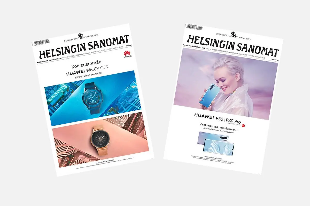 Viime huhtikuussa Huawei hyödynsi Hesarin monikanavaista etusivua Huawei P30 ja P30 Pro -lippulaivapuhelinten lanseerauskampanjaan.