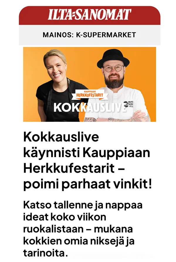 Tavoitteemme oli luoda inspiroivaa sisältöä Kauppiaan Herkkufestarit -kampanjaan, ja Kokkauslive onnistui siinä erinomaisesti. Herkullinen ruoka inspiroi meitä joka päivä, ja tämä toteutus toi sen upeasti esiin. Yhteistyö Sanoman kanssa oli mutkatonta ja sujuvaa alusta loppuun.”