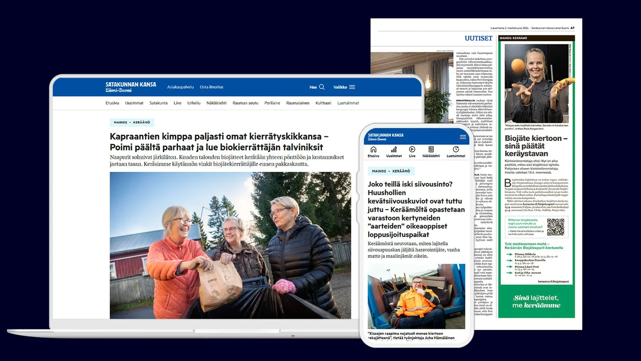 Keräämö hoitaa kunnan vastuulla olevien jätehuollon palveluiden käytännön järjestelyt alueensa 120 000 asukkaalle Satakunnassa. Artikkelien sarjalla alueen maakuntamediassa lisättiin ymmärrystä biojätteen erilliskeräyksen syistä ja kerrottiin biojätekeräyksen käytännön vinkeistä. Tarinankerronta puri yleisöön.