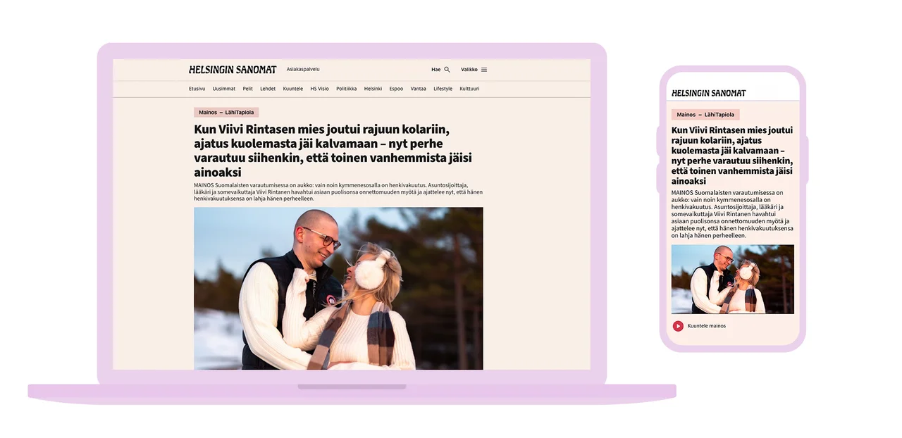 LähiTapiola toteutti maaliskuussa 2025 natiivimainonnan kampanjan yhteistyössä Sanoman kanssa. Kampanjan ytimessä oli vaikuttaja Viivi Rintasen tarina, joka julkaistiin sekä hänen omassa Instagramissaan, LähiTapiolan omilla sivuilla että HS Visiossa. Kampanja yhdisti monikanavaisesti natiivimainontaa, vaikuttajamarkkinointia ja taktista mainontaa.