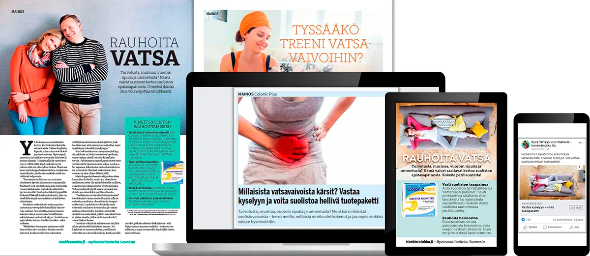 Natiiviartikkeli vatsavaivojen helpottamisesta julkaistiin HS:n kokosivuna digissä ja printissä sekä Hyvä Terveys -lehdessä, ET-lehdessä ja Sport-lehdessä.
