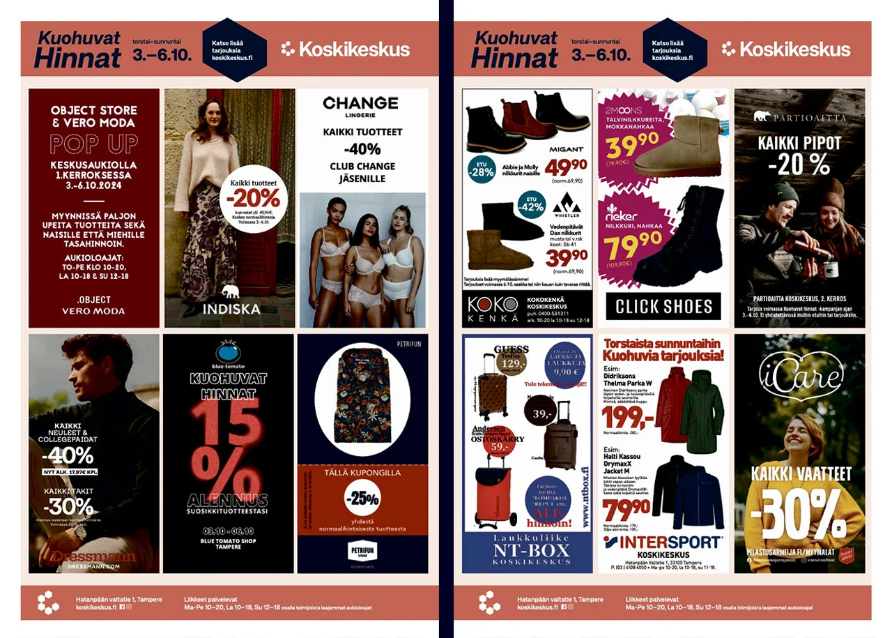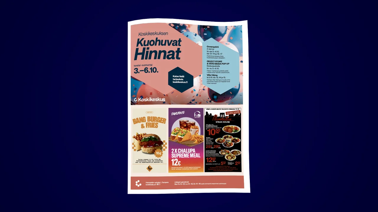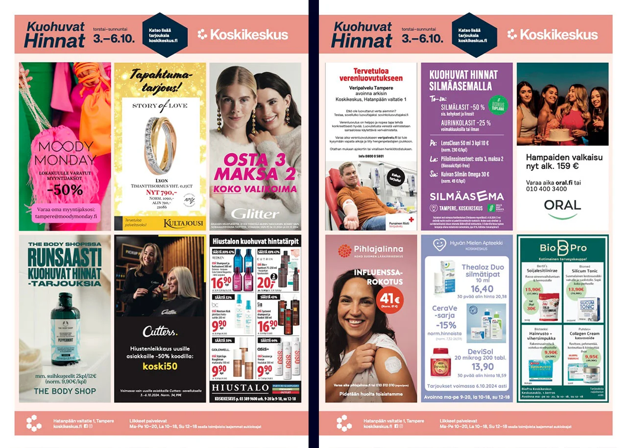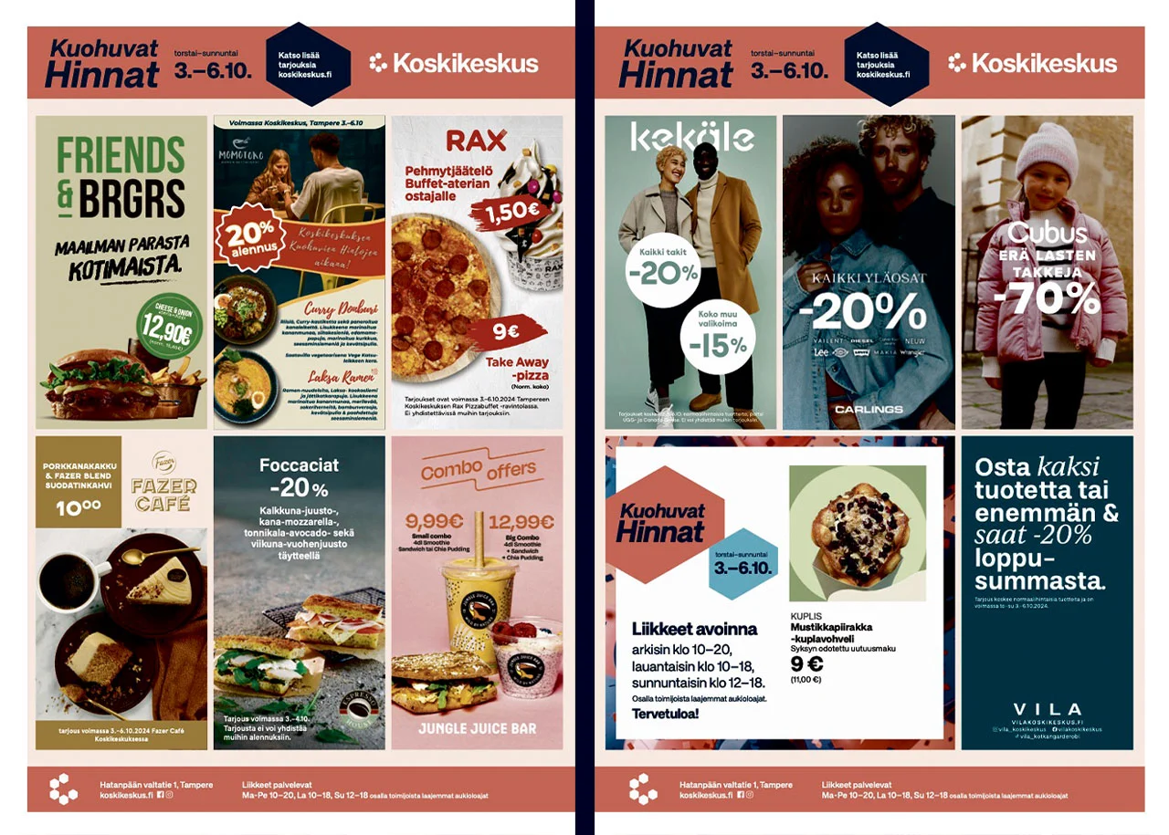 Kauppakeskus Koskikeskus on julkaissut vuoden 2024 aikana kaksi kahdeksansivuista liitettä Aamulehden välissä kevään ja syksyn Koskikeskuksen Kuohuvat Hinnat -hintakampanjansa yhteydessä.