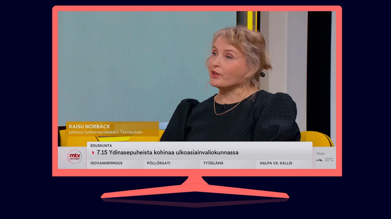 Terveystalon johtava työterveyslääkäri Kaisu Norbäck kutsuttiin MTV:n Huomenta Suomeen. Haastattelun aihe: Ovatko vaihdevuodet naisten uusi lasikatto?