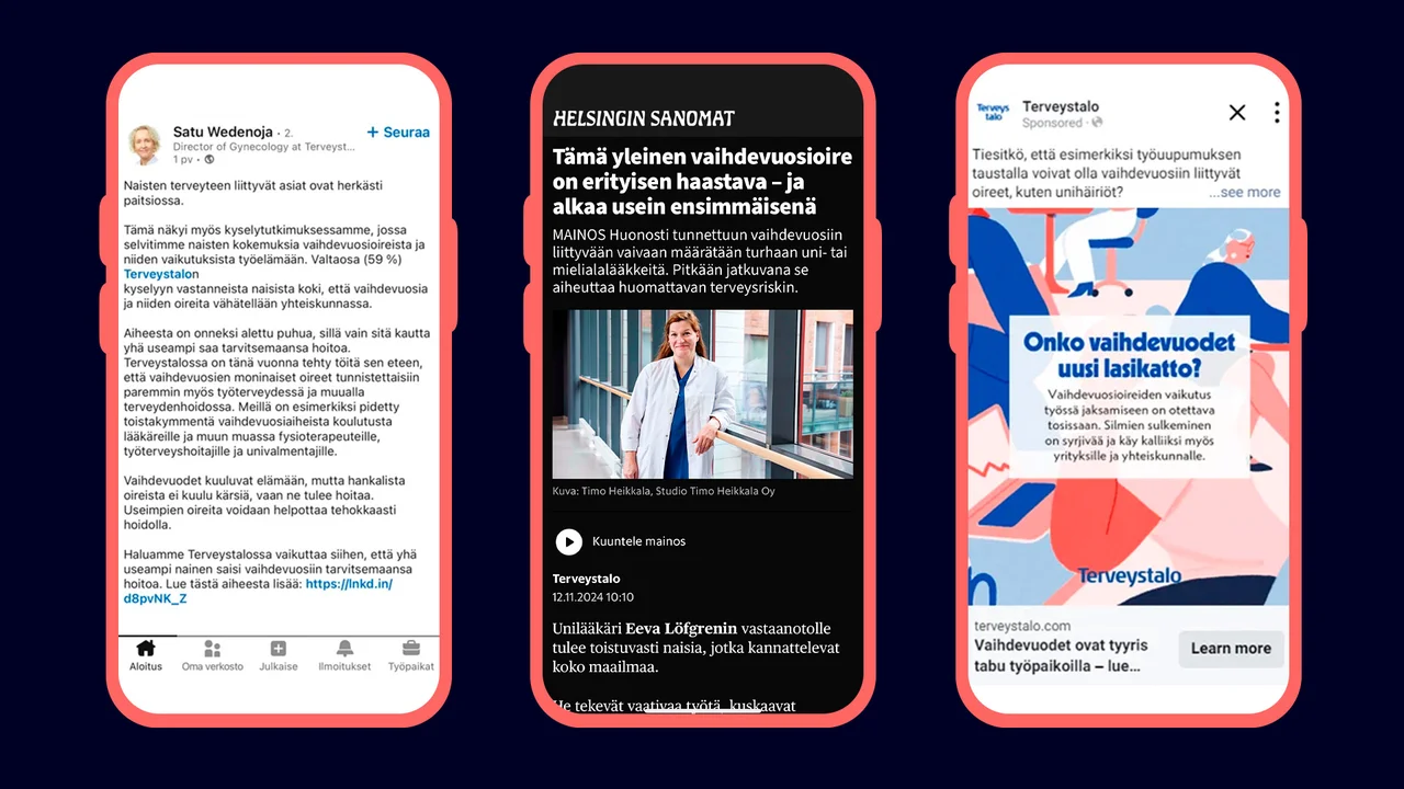 Näitä materiaaleja hyödynnettiin vaihdevuosiaiheisella kampanjasivustolla sekä jatkuvassa sisällöntuotannossa. Sisällöt perustuivat strategiatyön tuloksena syntyneeseen pitkäjänteiseen suunnitelmaan tuleville vuosille. Jatkuvan sisällöntuotannon konsepteiksi luotiin kohderyhmää puhuttelevia asiantuntija-artikkeleja, samastuttavia henkilötarinoita, taustoittavia ilmiöartikkeleja ja napakoita faktajuttuja. Sisällöt suunniteltiin monikanavaisiksi: ne näkyvät sosiaalisessa mediassa, Terveystalon verkkosivuilla, uutiskirjeissä ja webinaareissa sekä natiivisisältöinä Sanoman medioissa.