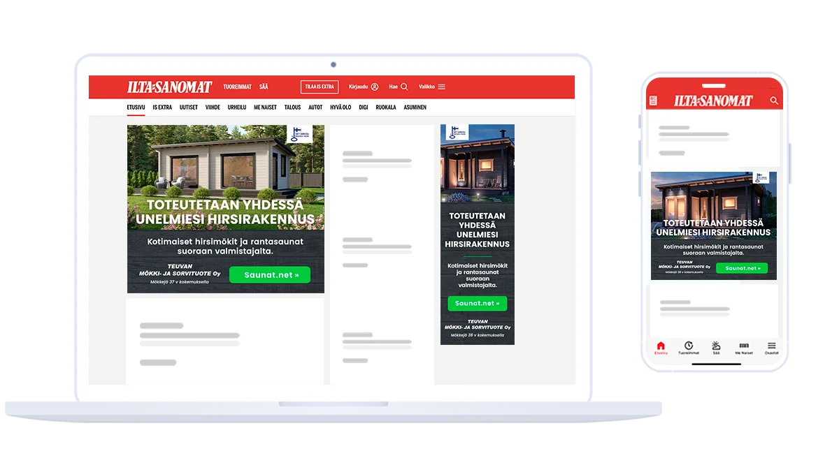 Teuvan Mökki ja Sorvituote kampanjoi Sanoman digiverkostossa valtakunnallisesti tulospohjaisella display-mainonnalla ja ostaa myös Google-näkyvyyden Sanoman kautta.