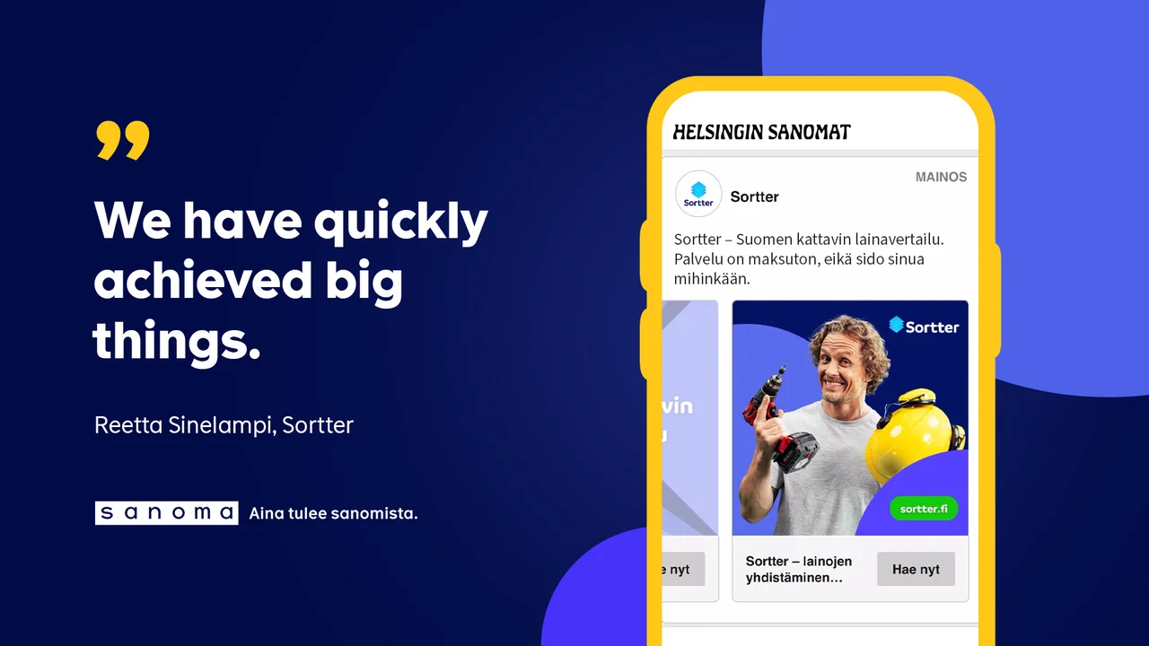 Founded in 2018, Sortter has rapidly grown into Finland’s leading loan comparison service. The company’s success is no coincidence but the result of determined and innovative marketing. Reetta Sinelampi, Sortter’s Director of Business and Development, says that working with Sanoma has played a decisive role in building the brand and increasing awareness.