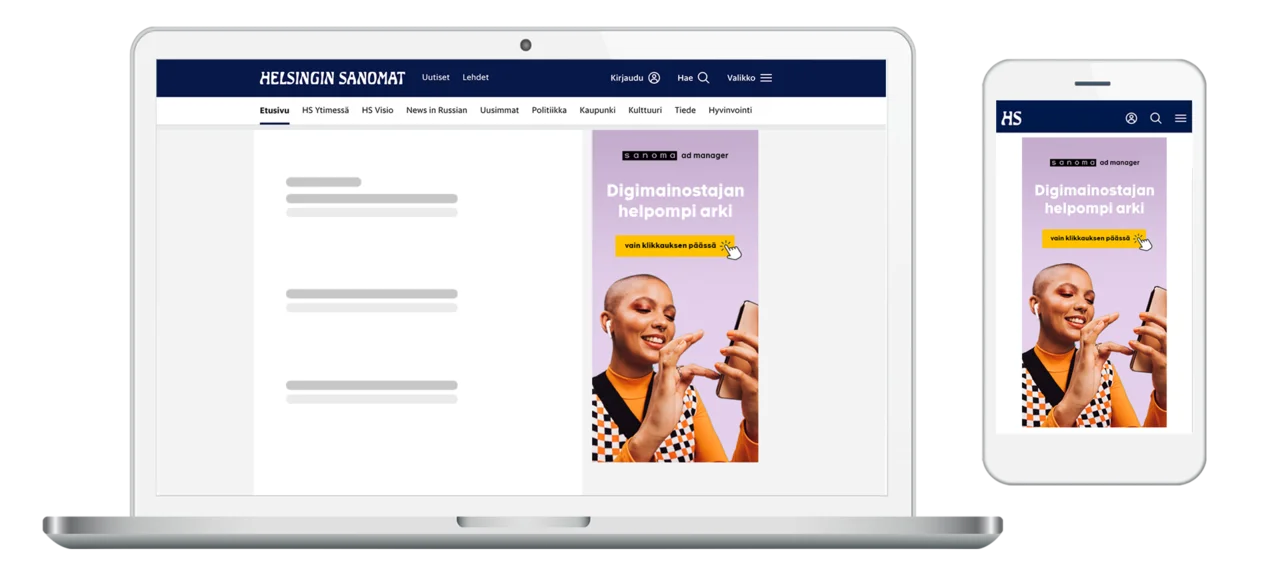 Näyttöpohjainen natiivinosto on päätelaiteriippumaton mainosmuoto, joka ohjaa joko Sanoman medioissa tai mainostajan omalla sivustolla sijaitsevaan natiiviartikkeliin.