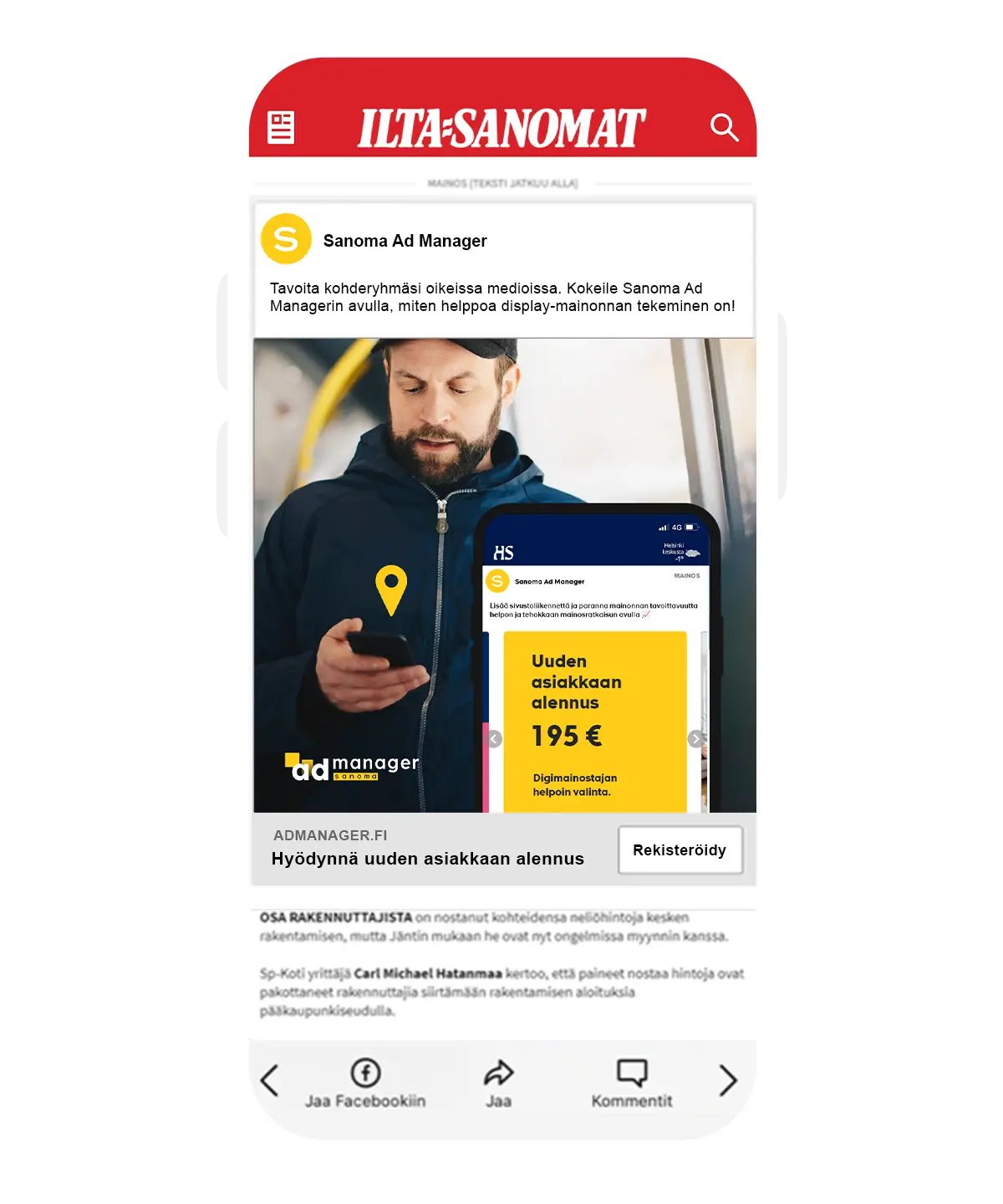 Kun valitset Sanoman Facebook- ja Instagram-mainoskumppaniksesi, yrityksesi ulottuvilla on samalla koko Sanoman mediatarjonta. Erilaisilla mediaratkaisujen yhdistelmillä kampanjasi teho voidaan nostaa täysin uudelle tasolle.