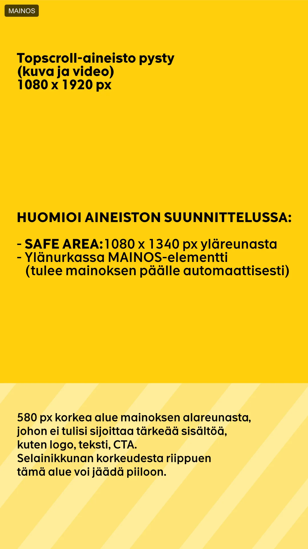 Huom! Mainosten ulkoasut saattavat hieman vaihdella sivustoittain, ja esim. HS käyttää mobiiliympäristössä mainosten ympärillä marginaaleja jolla on vaikutuksia mainoksen ulkoasuun. Marginaaleja ei kuitenkaan näytetä seuraavissa mainosmuodoissa; natiivi- ja nostotuotteet, topscroll, midscroll, liukuva kokosivu ja tapetti.