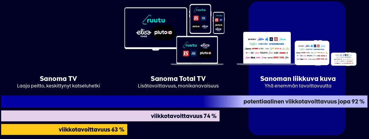 Lähde: Finnpanel Oy, TV-mittaritutkimus, AdEdge ja Total TV-tutkimus, AdEdge VOD – vkot 1-52 2024, keskimääräinen viikkotavoittavuus. Kantar Mind Kuluttaja, vuosi 2024. , Sanoman Tv+videoverkoston (instream ja outstream) viikkotavoittavuus, kun kaikilla alustoilla hyödynnetään video täyteen potentiaaliin. Kohderyhmä A25-64